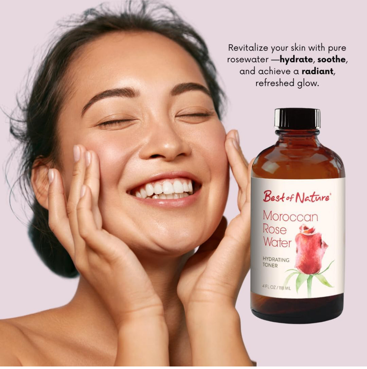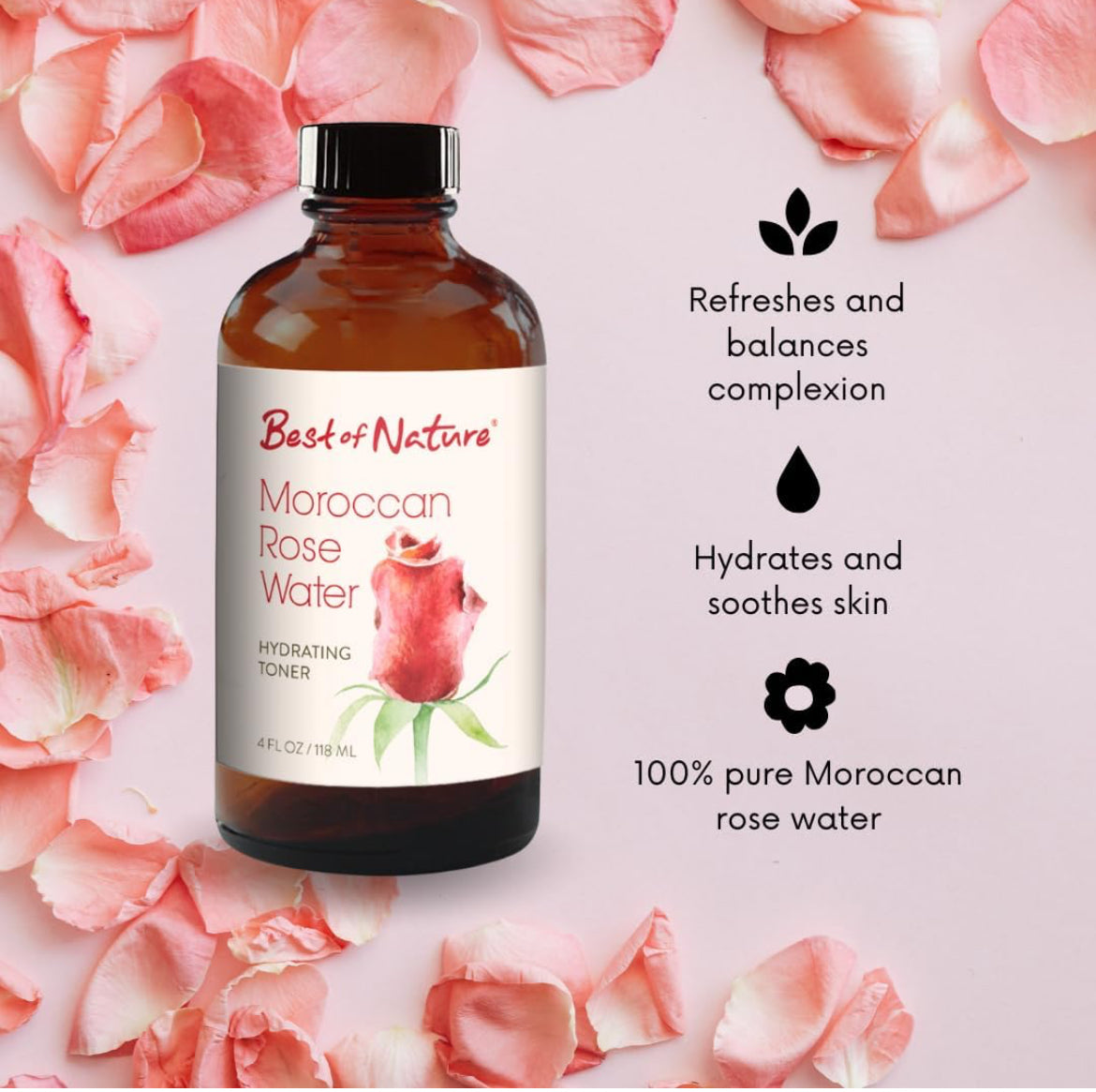 ✨ Best of Nature’s Moroccan Rose Water is 100% pure and natural, made from fresh Rosa Damascena petals. The Rose Water acts as a toner to naturally balance the skin’s pH, making it soft, smooth and radiant. Its unique properties soothe and calm skin irritations, while cleansing and hydrating the skin naturally. Suitable for all skin types: normal, oily, dry and sensitive. 4 oz bottle.